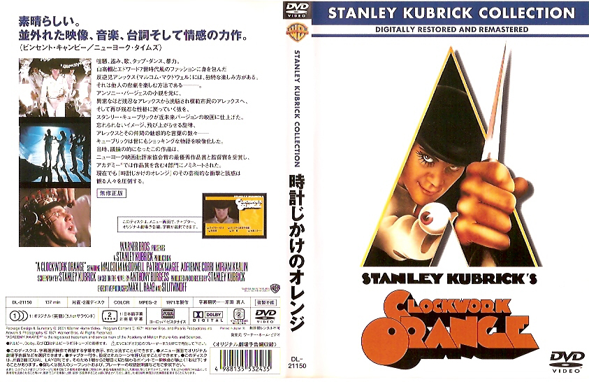 時計じかけのオレンジ、昨日に続いてスタンリー・キューブリックの作品です。 この時計じかけのオレンジという映画はキューブリックの作品の中でも、私の大好きな作品です、この映画もDVDを購入してから、もう何度観賞したか分かりません。 原作はアンソニー・バージェスのディストピア小説らしいのですが、やはりスタンリー・キューブリックの手によってかなり独特の世界観が描かれています。 この映画の日本での公開は1972年ですが、もう35年も経っていますが、この映画の魅力は一向に衰えていないと思います。 35前にこの映画を劇場でリアルタイムで鑑賞した方にとっては非常に衝撃的な映画だったと思います。 主人公達の使用するナッドサット語やバックに流れる第九、雨に唄えばなどの名曲が非常に印象的であると思います。 |
